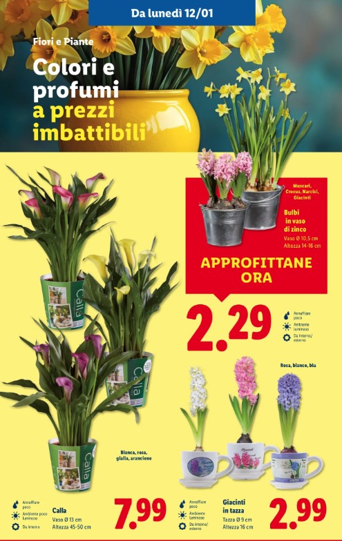 I bulbi in vaso di zinco sono proposti a 2,29 €, così come i bulbi di Lilium in confezione assortita. I Giacinti in tazza sono disponibili a 2,99 €, mentre le Calle hanno un prezzo di 7,99 €, giustificato dalle dimensioni e dall’eleganza della pianta.