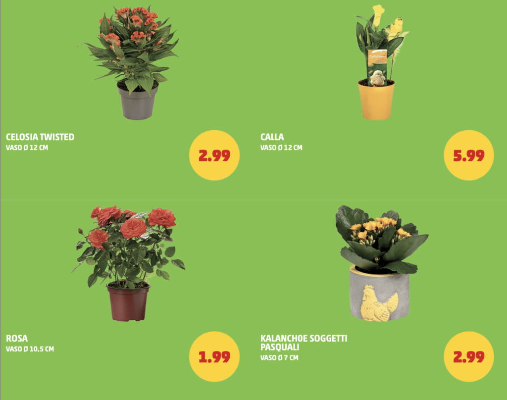 Nel volantino sono presenti quattro tipologie principali, ognuna con caratteristiche diverse ma complementari. La Rosa in vaso da 10,5 cm è proposta a 1,99€, rappresentando la soluzione più economica e immediata. La Celosia Twisted in vaso da 12 cm è disponibile a 2,99€, mentre allo stesso prezzo si trova anche il Kalanchoe con soggetti pasquali in vaso da 7 cm, pensato anche come elemento decorativo stagionale.