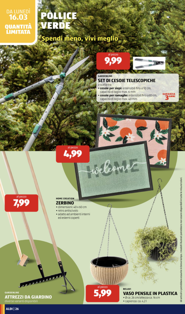 menti utili per la manutenzione delle piante e per l’organizzazione di balconi, terrazzi e giardini. Le offerte sono disponibili in quantità limitata, come indicato nel volantino, e rappresentano una soluzione interessante per chi vuole preparare gli spazi esterni in vista della stagione primaverile.