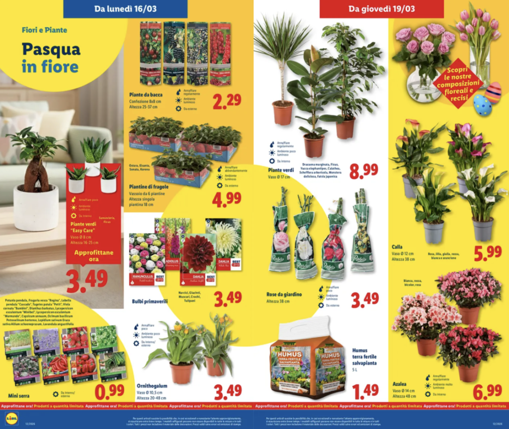 L’iniziativa, dedicata al tema “Pasqua in fiore”, include diverse varietà di piante ornamentali, fiori stagionali e piccoli prodotti per il giardinaggio. Si tratta di una proposta pensata sia per chi desidera rinnovare il balcone o il giardino sia per chi vuole semplicemente aggiungere un elemento naturale all’interno della casa.