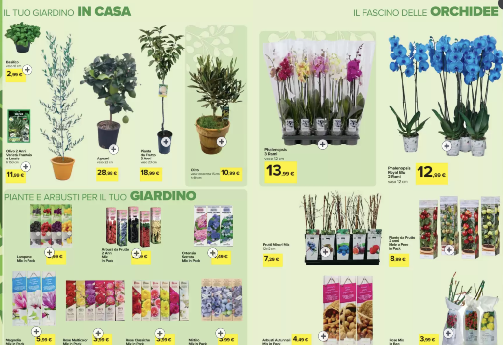 Il volantino Carrefour dedicato al verde propone quindi una selezione piuttosto ampia di piante per diverse esigenze, dalla decorazione degli interni alla coltivazione in giardino. Le offerte permettono di scegliere tra prodotti economici, come le piante aromatiche o gli arbusti in pack, fino a soluzioni più decorative come le orchidee o le piante da frutto in vaso.